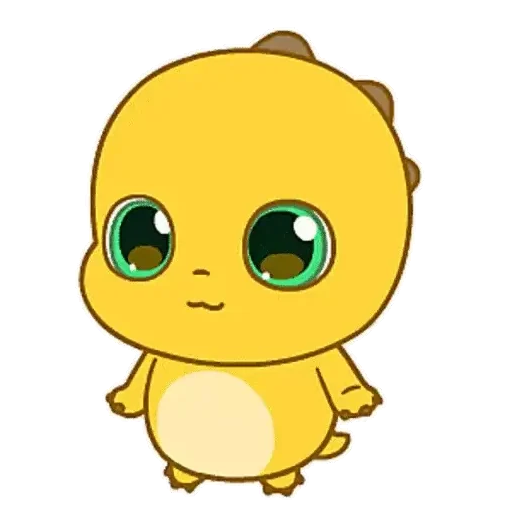 Um dinossauro amarelo fofo com olhos verdes grandes e bochechas rosadas, com um pequeno chifre na cabeça.