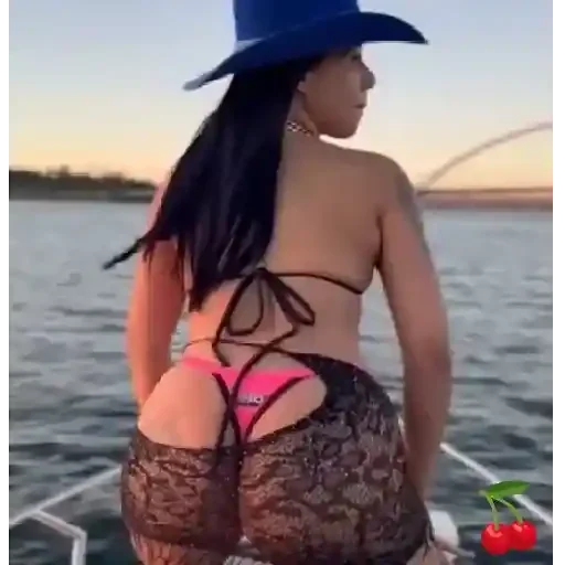 Mulher de biquíni rosa e calcinha preta com chapéu azul, de costas, em um barco no lago ao pôr do sol.