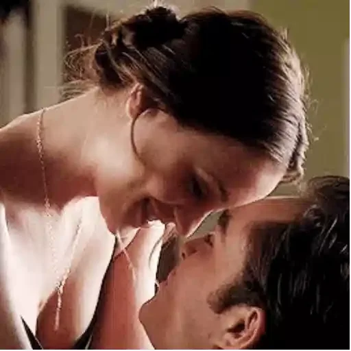 Cena de beijo romântico entre casal, com a mulher inclinada para frente e o homem com os olhos fechados.