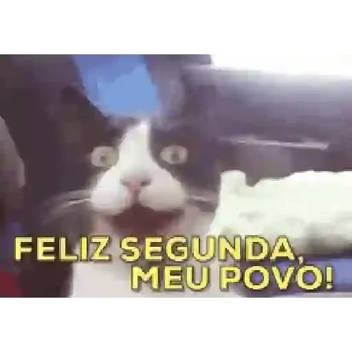 Gato preto e branco com expressão surpresa e texto 'Feliz segunda, meu povo!' em amarelo.
