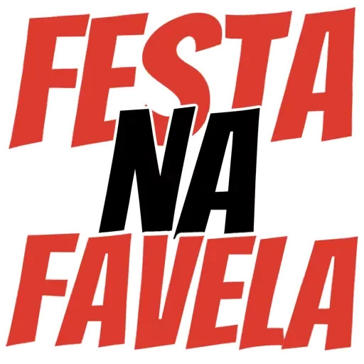 Letras grandes coloridas que formam a frase 'FESTA NA FAVELA'. As letras 'FESTA' e 'FAVELA' são vermelhas com contorno branco, enquanto 'NA' é preta.