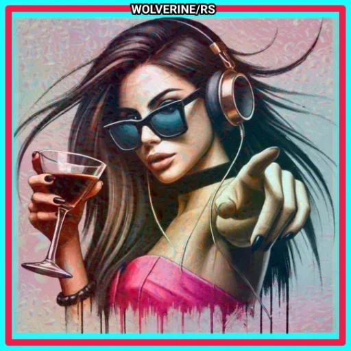 Uma mulher com óculos escuros e fones de ouvido aponta com uma taça de vinho na mão. Ela tem cabelo castanho e um top rosa.