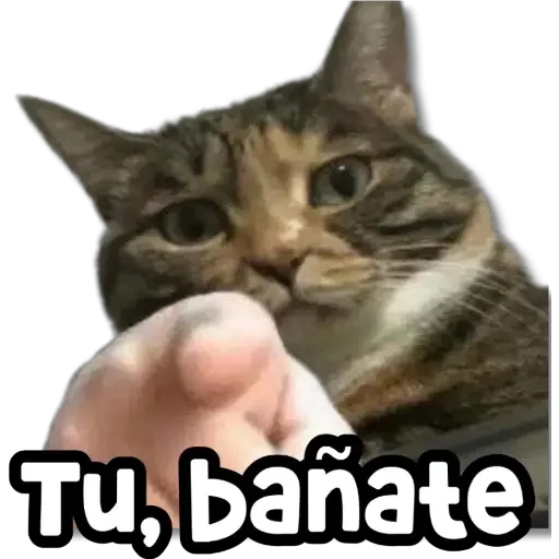 Gato com expressão séria olhando para a mão de alguém, com texto 'Tu, bañate' em branco com contorno preto.