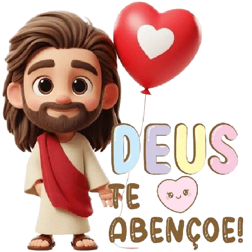Um desenho de Jesus Cristo com um balão vermelho em forma de coração e as palavras 'DEUS TE ABENÇOE!' escrito ao lado.