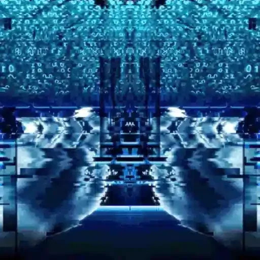 Uma cena digital abstrata com tons de azul, padrões geométricos e reflexos simétricos.