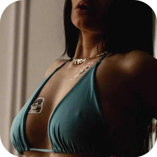 Mulher de biquíni verde com colar e tatuagem no seio.