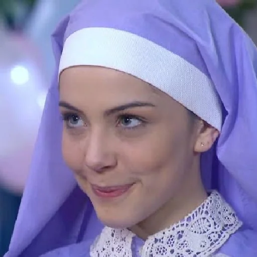 Uma mulher jovem com um sorriso discreto, vestida com um hábito de freira roxo e um véu branco na cabeça.