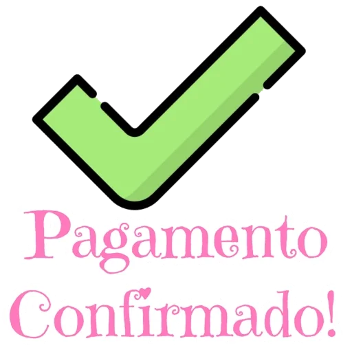 Um símbolo de check verde e o texto 'Pagamento Confirmado!' em rosa.