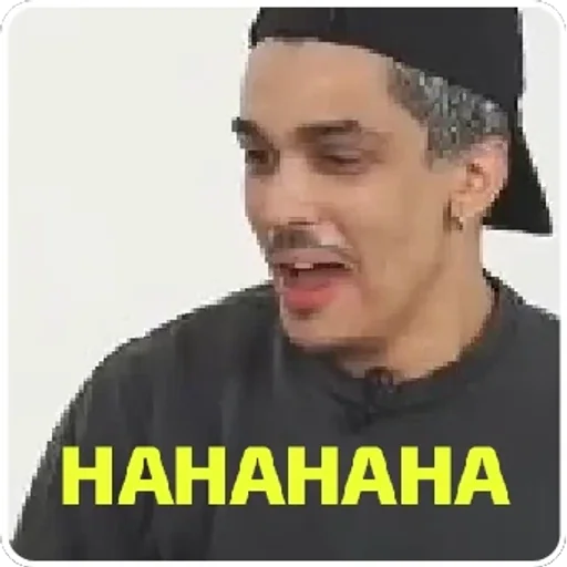 Um homem com expressão de alegria e surpresa, usando um boné preto e uma camisa preta, com o texto 'HAHAHAHA' em amarelo na parte inferior.