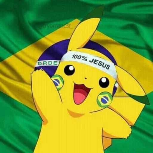 Pikachu com uma faixa branca na testa que diz '100% JESUS', orelhinhas erguidas e olhos grandes, com lágrimas nos olhos e a bandeira do Brasil ao fundo.
