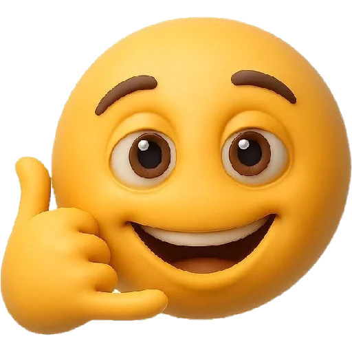 Um emoji amarelo com um sorriso largo e sobrancelhas grossas, fazendo um gesto de 'shaka' ou 'hang loose' com a mão esquerda.