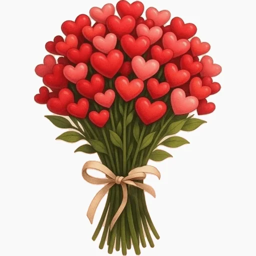 Um buquê de flores em forma de coração, com muitas flores vermelhas e rosa, amarradas com uma fita.