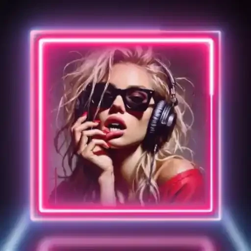 Mulher loira com óculos escuros e fones de ouvido, mão no rosto, dentro de um quadro rosa com efeito neon.