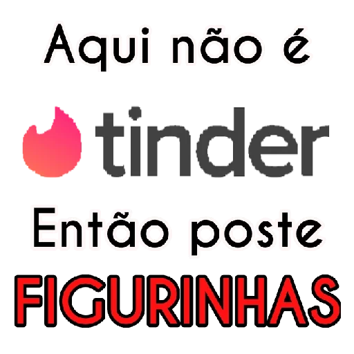 Um logotipo do Tinder com texto em preto e uma chama rosa, acompanhado das frases 'Aqui não é' e 'Então poste FIGURINHAS' em preto e vermelho.