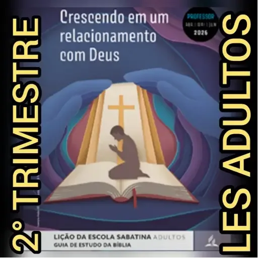 Uma pessoa ajoelhada em frente a um livro aberto com uma cruz, lendo. Ao fundo, texto que diz 'Crescendo em um relacionamento com Deus' e '2° Trimestre' e 'Les Adultos'.