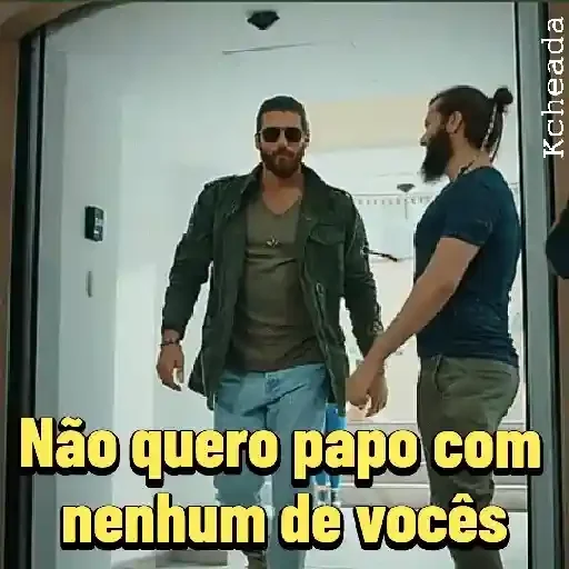Dois homens saindo de uma porta, um de óculos escuros e jaqueta, o outro com um coque e barba. Legenda amarela: 'Não quero papo com nenhum de vocês'