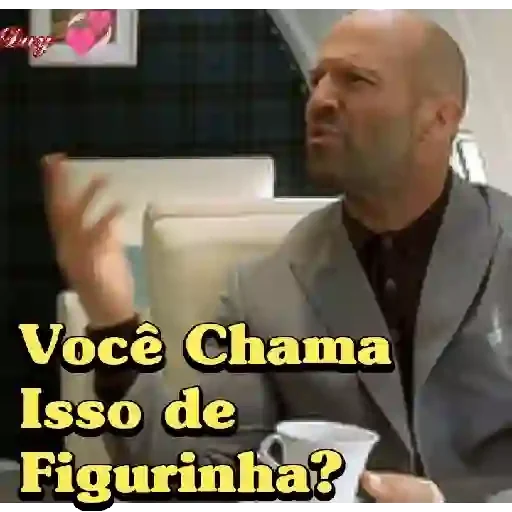 Um homem careca com um blazer cinza e um colarinho preto, com uma xícara de café na mão, questiona 'Você Chama Isso de Figurinha?' com texto em amarelo.