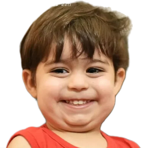 Menino com cabelo castanho e camiseta laranja, fazendo uma careta engraçada com os dentes para fora.