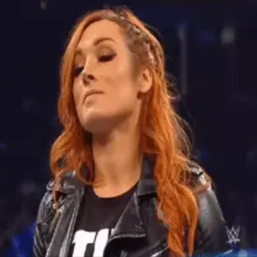 Mulher com cabelo laranja e jaqueta de couro preto, parecendo uma lutadora, com olhos fechados e expressão séria, vestindo uma camiseta preta com letras brancas.