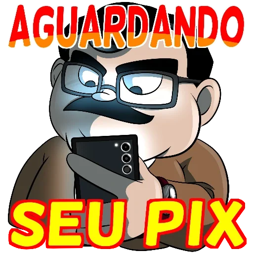 Um sticker com o texto 'AGUARDANDO O PIX' em letras grandes e pretas, com um emoji de uma cara amarela com saliva verde.