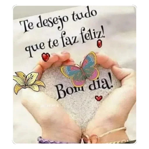 Mãos formando um coração com uma borboleta colorida no centro, texto "Te desejo tudo que te faz feliz! Bom dia!"