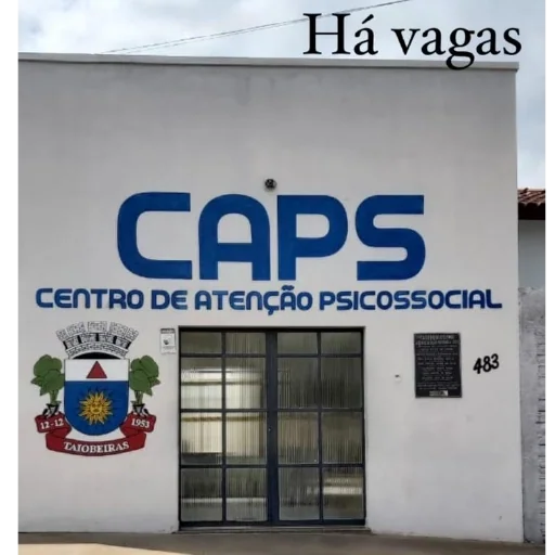 Uma fachada de prédio com a sigla 'CAPS' em azul e o brasão ao lado, indicando o Centro de Atenção Psicossocial.
