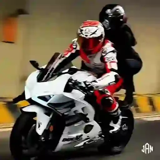 Dois motociclistas em uma moto branca, um de vermelho e o outro de preto, em um túnel ou passagem com faixa amarela e…