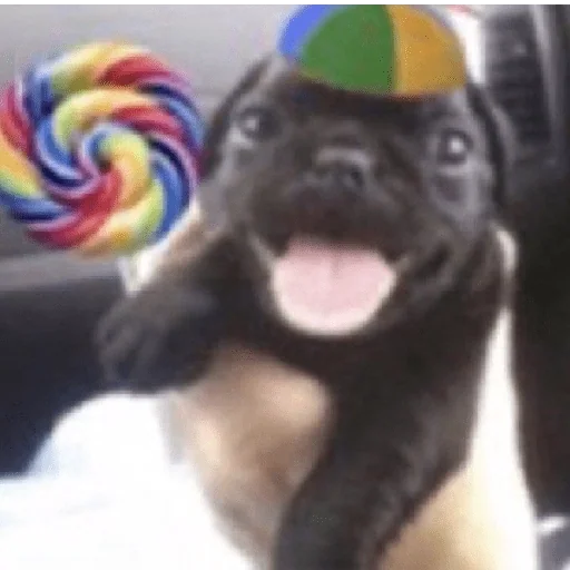 Um cachorro pug preto com a língua para fora e um chapéu colorido na cabeça, ao lado de um grande pirômetro de cores.