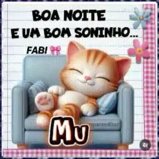 Um gato laranja de olhos fechados sentado em um sofá azul, com a frase 'BOA NOITE E UM BOM SONINHO...' acima dele e 'FABI' e 'Mu' no design.