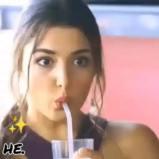 Mulher com expressão surpresa enquanto bebe de um copo com canudo. Ela tem cabelo castanho e olhos castanhos. Há um texto 'HE.' no canto inferior esquerdo.