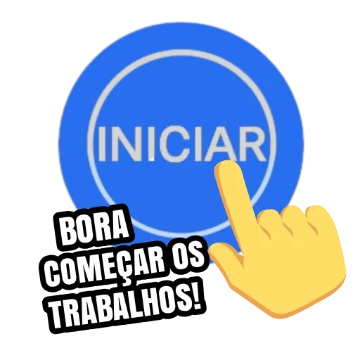 Uma mão amarela aponta para um botão azul com o texto 'INICIAR' e há também o texto 'BORA COMEÇAR OS TRABALHOS!' em branco com fundo preto.