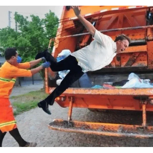 Dois homens, um de laranja e outro de branco, em uma situação de confronto perto de um caminhão de lixo. O homem de branco parece estar sendo jogado para dentro do caminhão.