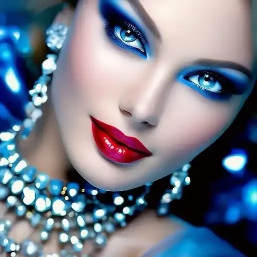 Rosto de mulher com maquiagem pesada, olhos azuis, lábios vermelhos e joias brilhantes.