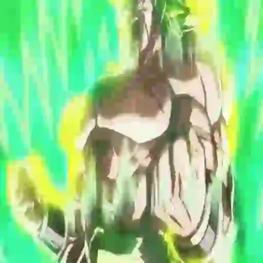 Um personagem de anime com cabelo verde e fundo verde brilhante, com expressão determinada e braço estendido.