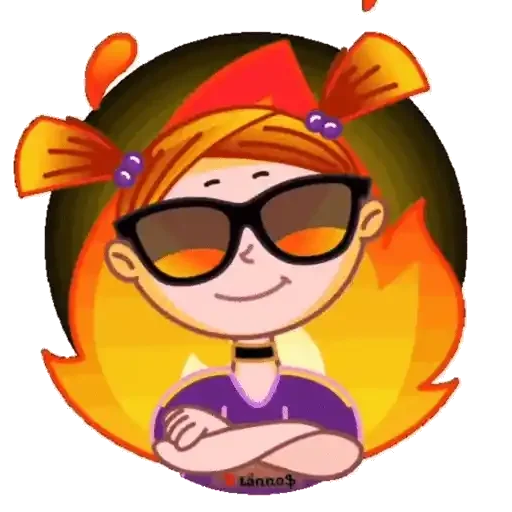 Menina de óculos de sol com cabelo laranja e chamas ao fundo.