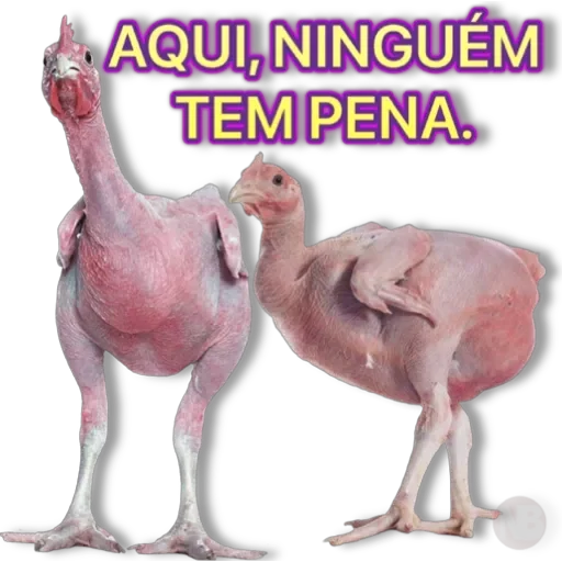 Dois peruas rosa com expressão séria, um olhando para o outro. O texto 'AQUI, NINGUÉM TEM PENA.' está escrito em amarelo com contorno roxo acima deles.