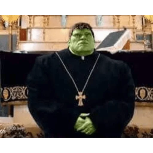 O Hulk vestido de padre, com uma cruz ao pescoço, em um ambiente que parece uma igreja.