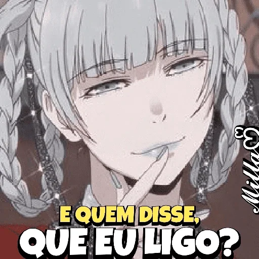 Uma garota de anime com cabelos grisalhos em tranças e franja, com expressão pensativa e o dedo indicador na boca. O texto 'E QUEM DISSE, QUE EU LIGO?' aparece em destaque.