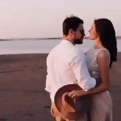 Um casal se beijando na praia, o homem de camisa branca e chapéu, a mulher de vestido claro.