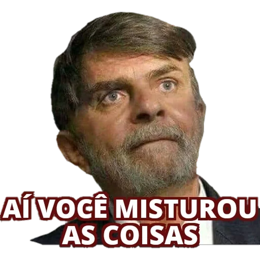 Um homem com cabelo castanho e barba grisalha, parecendo confuso ou surpreso, com o texto "AÍ VOCÊ MISTUROU AS COISAS" em vermelho abaixo dele.