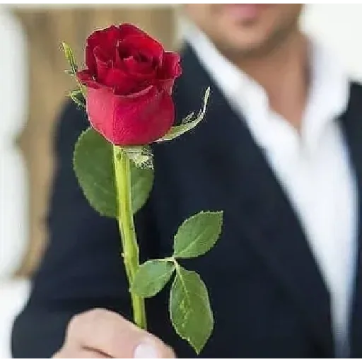 Um homem de terno e camisa branca segurando uma rosa vermelha.
