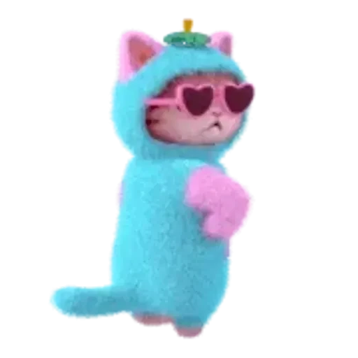 Gatinho rosa usando óculos de sol em forma de coração e um macacão azul com capuz, com uma pequena coroa verde na cabeça.