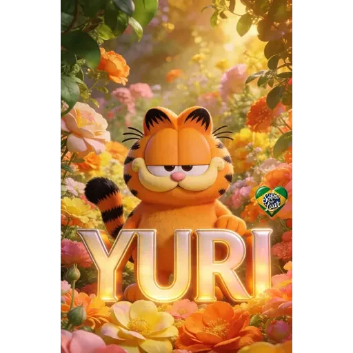 Gato laranja com olhos castanhos e orelhas pretas aparece em meio a flores coloridas. A palavra 'YURI' está escrita em letras grandes e iluminadas na frente do gato.