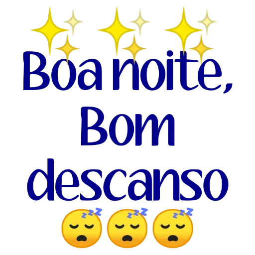 Um texto em azul que diz 'Boa noite, Bom descanso' com três emojis de dormir e estrelas brilhantes amarelas.