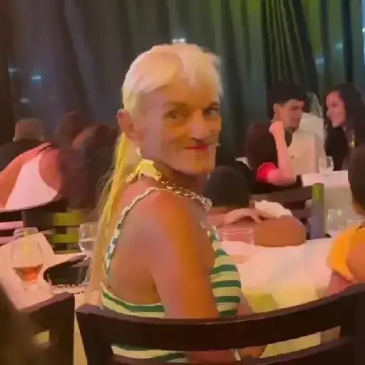 Mulher loira sentada à mesa em um restaurante, vestindo uma blusa listrada verde e branca.