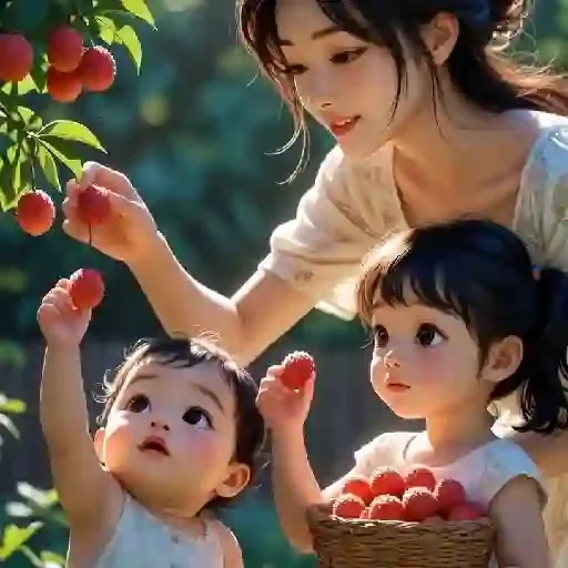 Uma mulher adulta e duas crianças, uma bebê e uma menina, colhendo maçãs em um pomar. A mulher e as crianças estão vestidas de branco e seguram maçãs nas mãos.