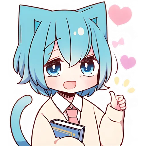 Uma menina de anime com cabelo azul e orelhas de gato segura um livro e faz um gesto de aprovação, com corações e borboletas ao redor.