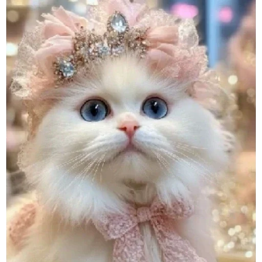 Gato branco com olhos azuis, usando uma coroa de flores rosa e uma gravata rosa. O gato tem um focinho rosa e bigodes brancos.