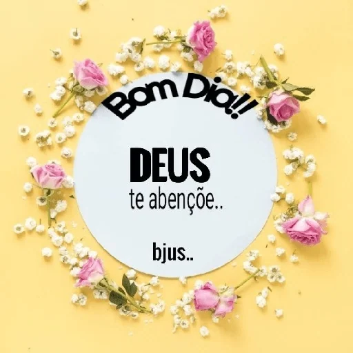Um círculo branco com as palavras 'Bom Dia!! DEUS te abençoe... bjus...' em preto, cercado por flores rosadas e pequenas flores brancas em um fundo amarelo.