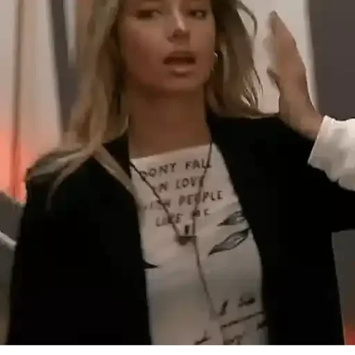 Uma mulher loira com um blazer preto e uma camisa branca com texto 'DON'T TRY TO BE PEOPLE'